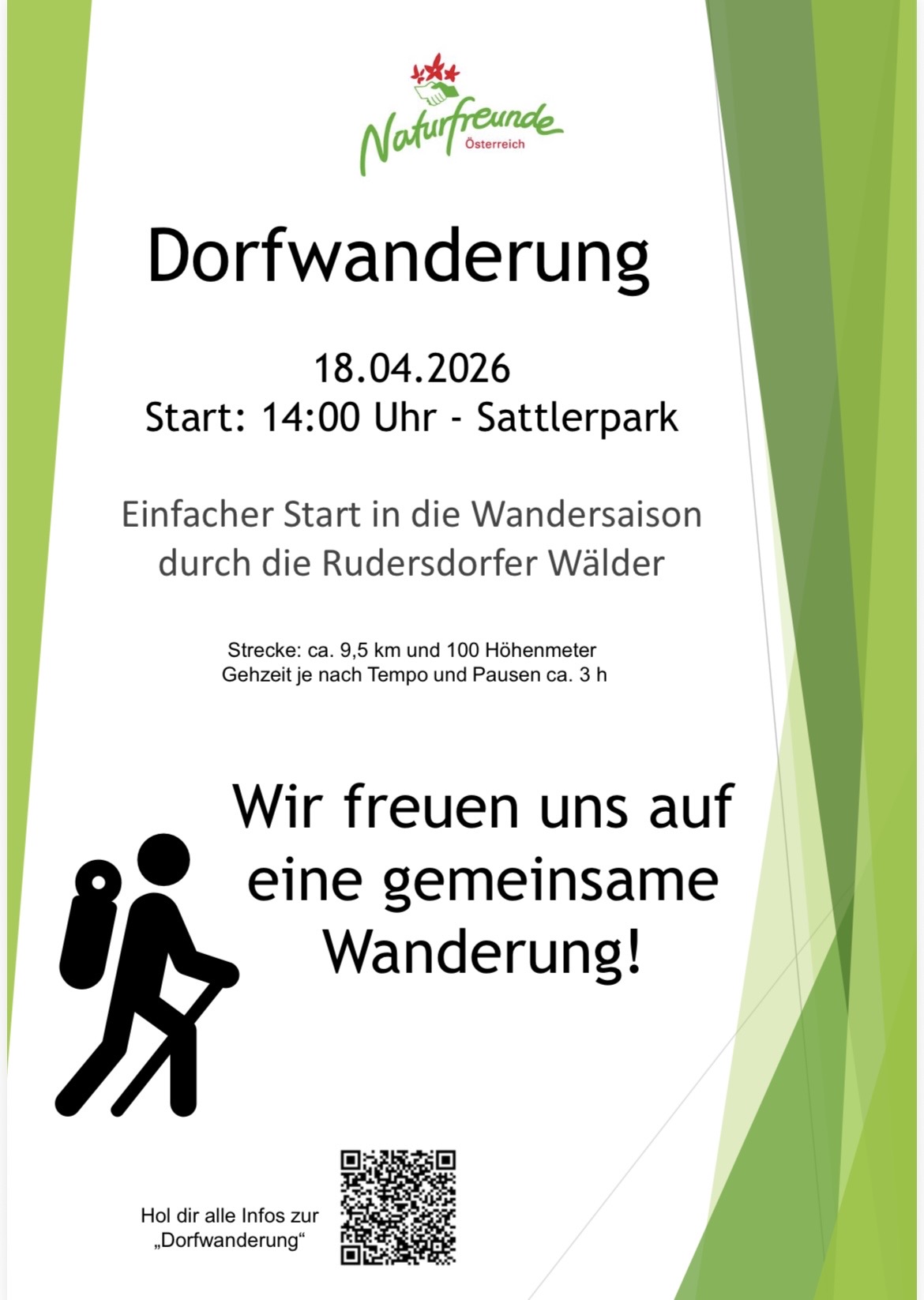 Dorfwanderung am 18. April 2026 mit Start um 14:00 Uhr im Sattlerpark in Rudersdorf. Einfacher Start in die Wandersaison durch die Rudersdorfer Wälder.