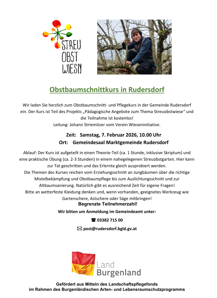 Anmeldung bitte im Gemeindeamt unter 03382 715 00 oder post@rudersdorf.bgld.gv.at