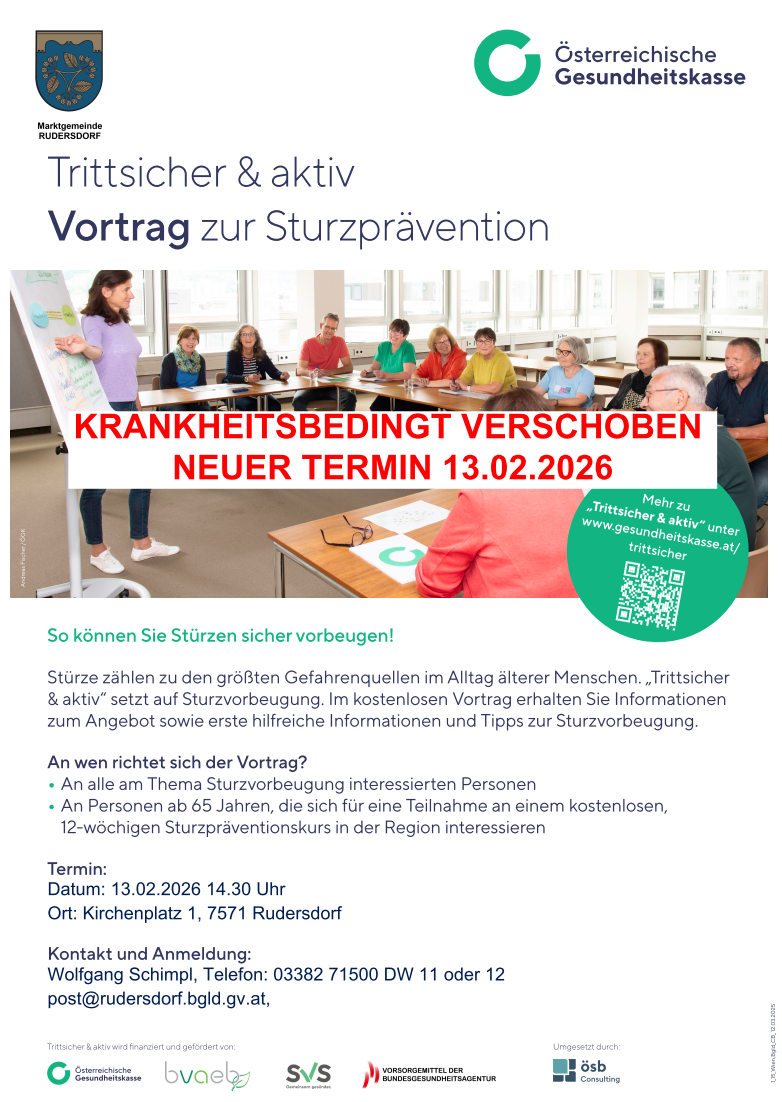 In weiterer Folge wird dann ein 12-wöchiger Sturzpräventionskurs im Gemeindeamt Rudersdorf durchgeführt. Starttermin wird noch bekanntgegeben.